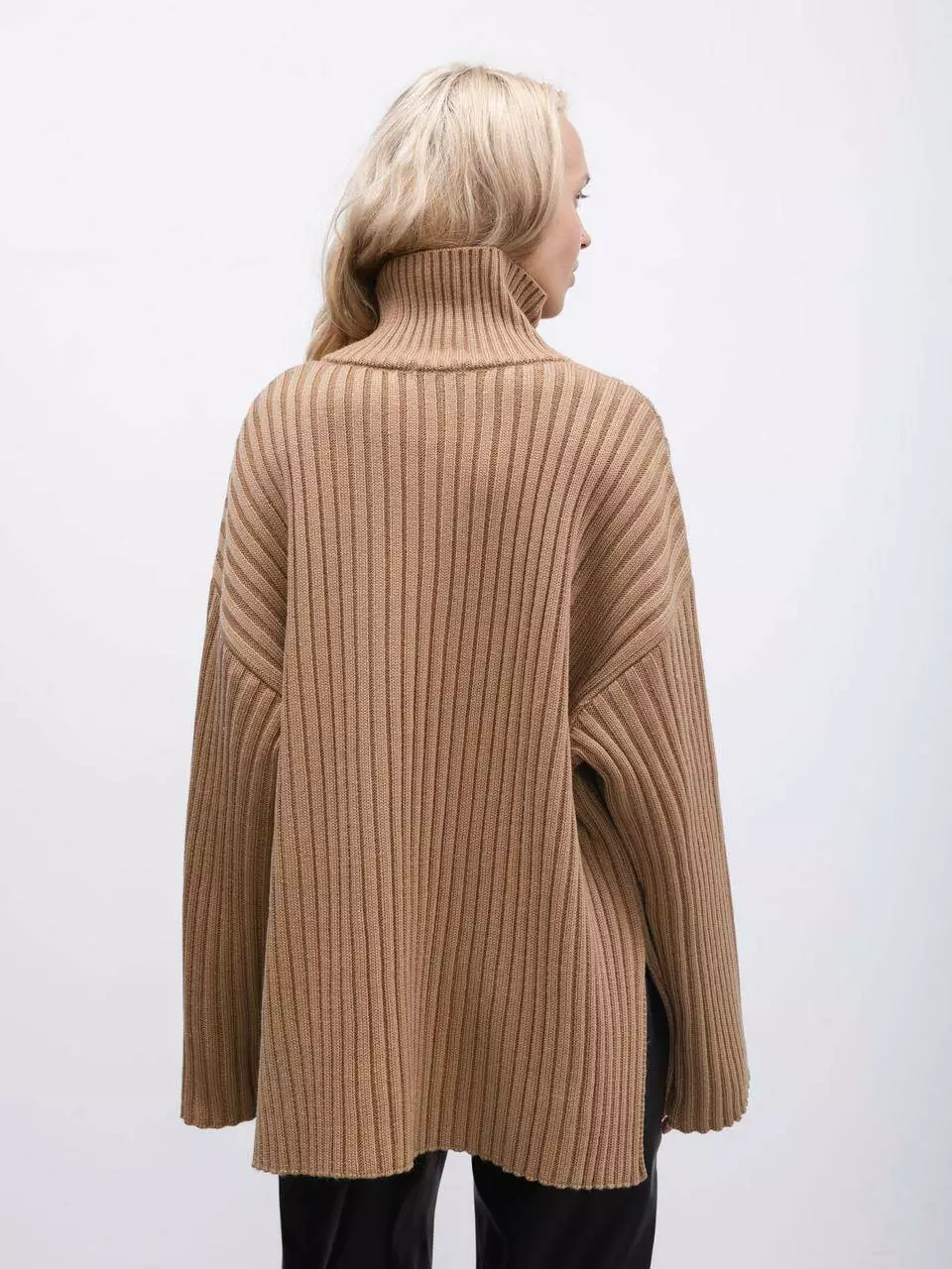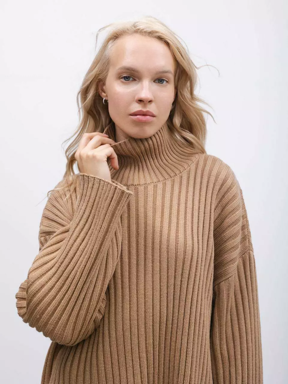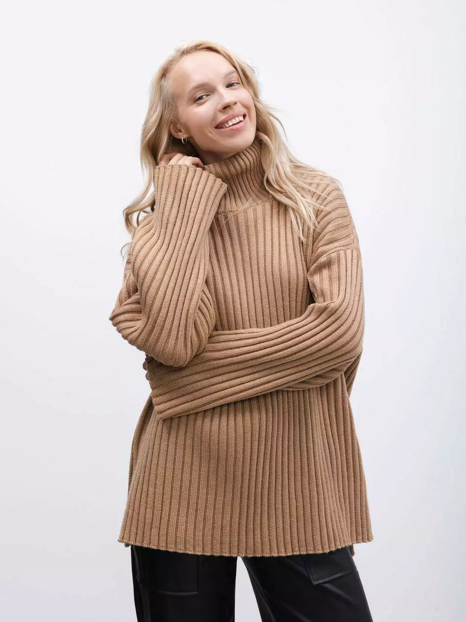 Теплий і м’який светр оверсайз бежевого кольору з високим коміром р. XS-S