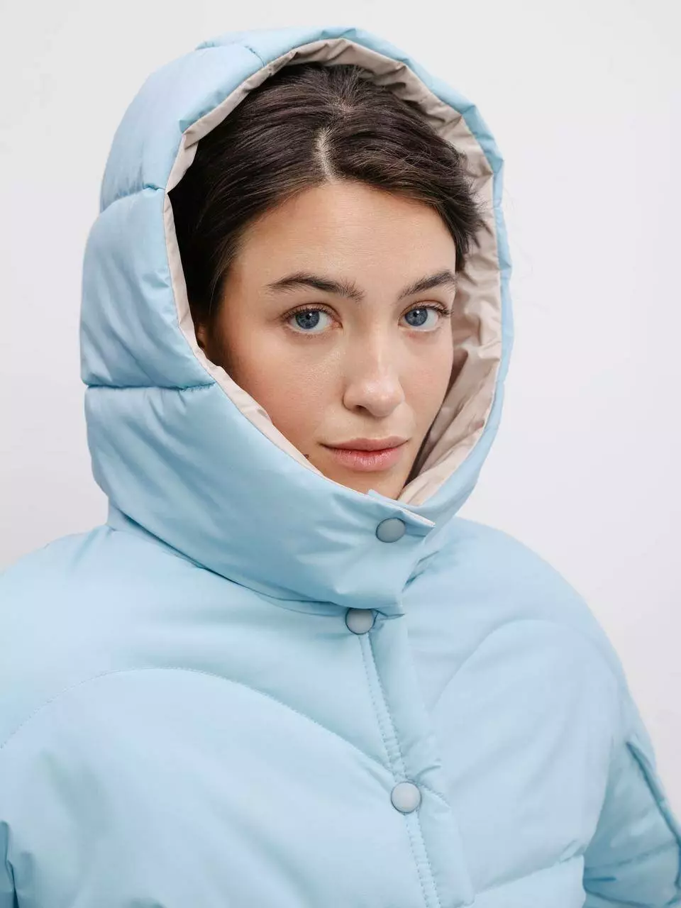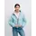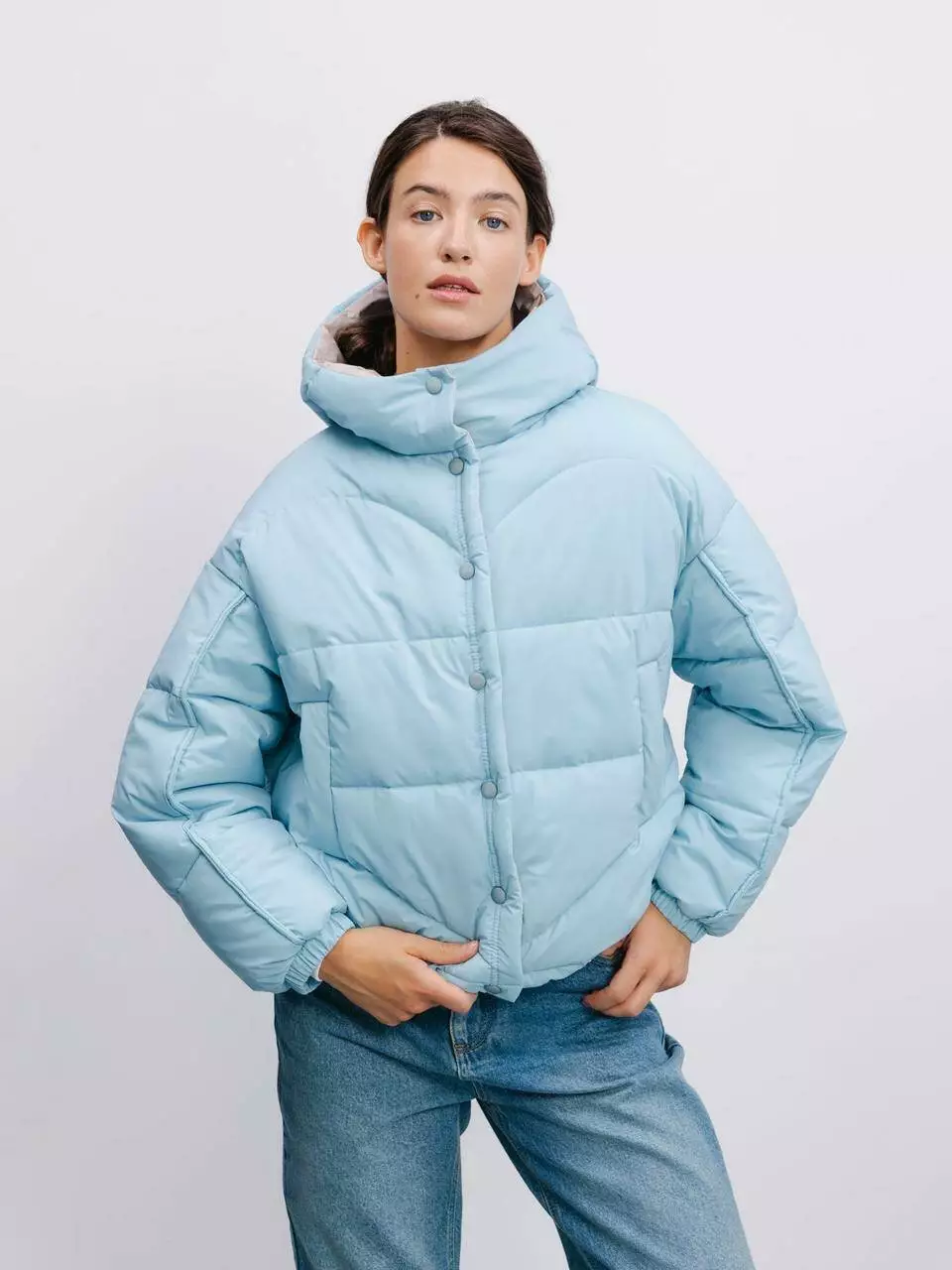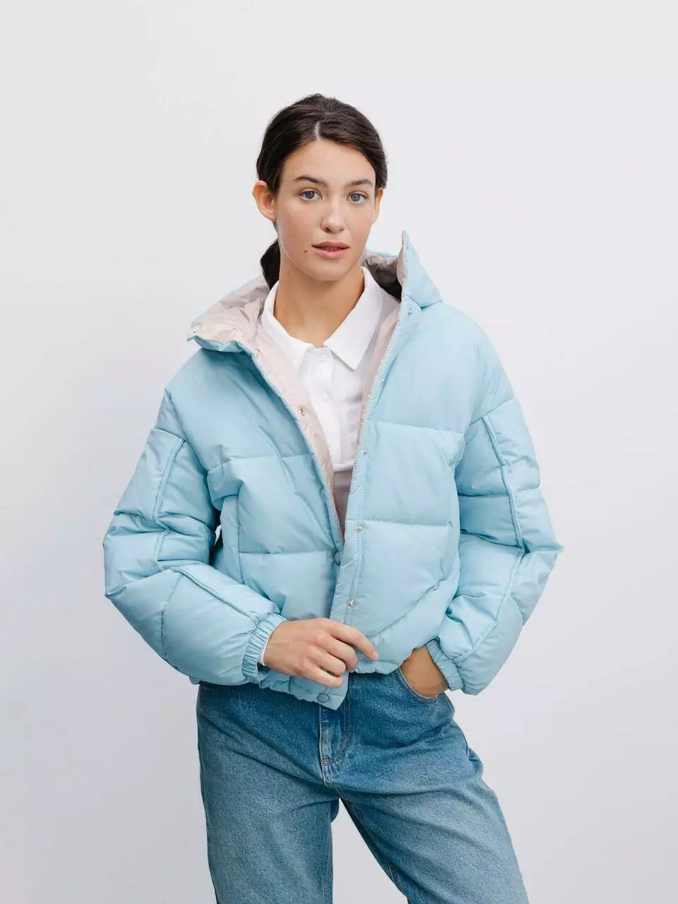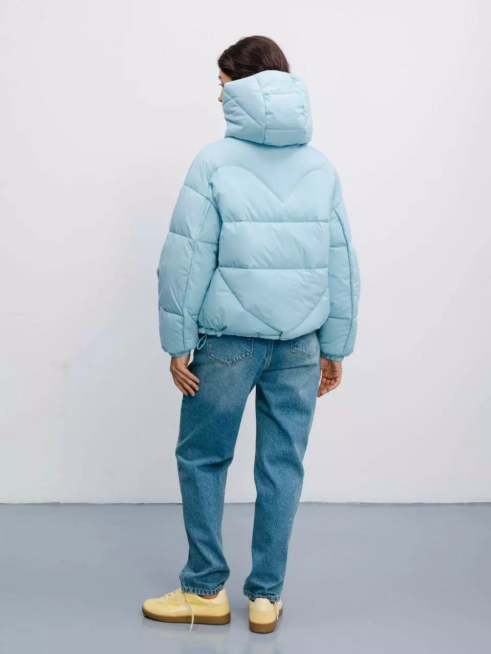 укороченою світло-блакитною стьобаною курткою. Виготовлена зі